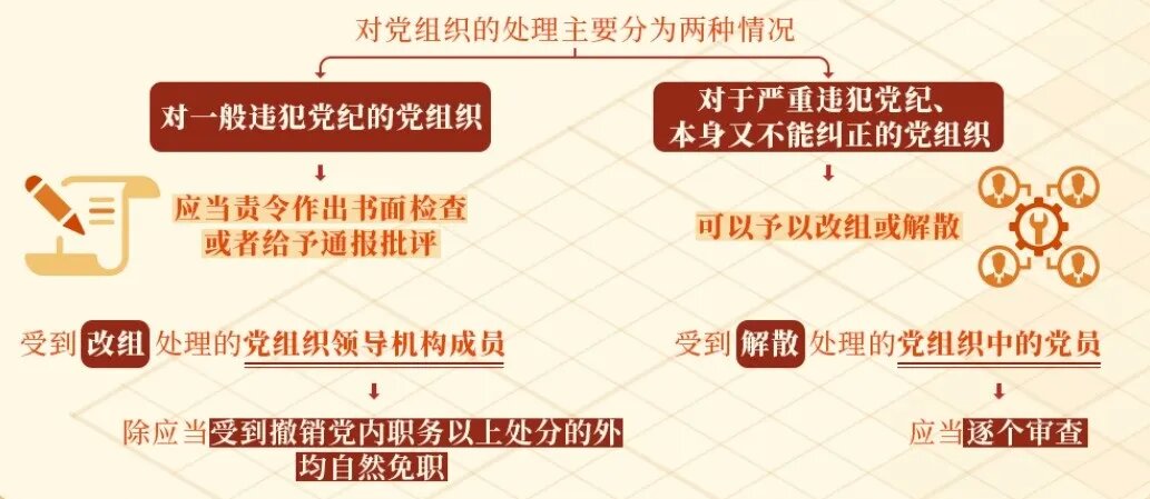 根據(jù)《中國共產(chǎn)黨紀律處分條例》規(guī)定,對黨組織的處理主要分為兩種情況:對一般違犯黨紀的黨組織,上級黨組織應當責令其作出書面檢查或者給予通報批評;對于嚴重違犯黨紀、本身又不能糾正的黨組織,上一級黨的委員會在查明核實后,根據(jù)情節(jié)的嚴重程度,可以予以改組或解散。
