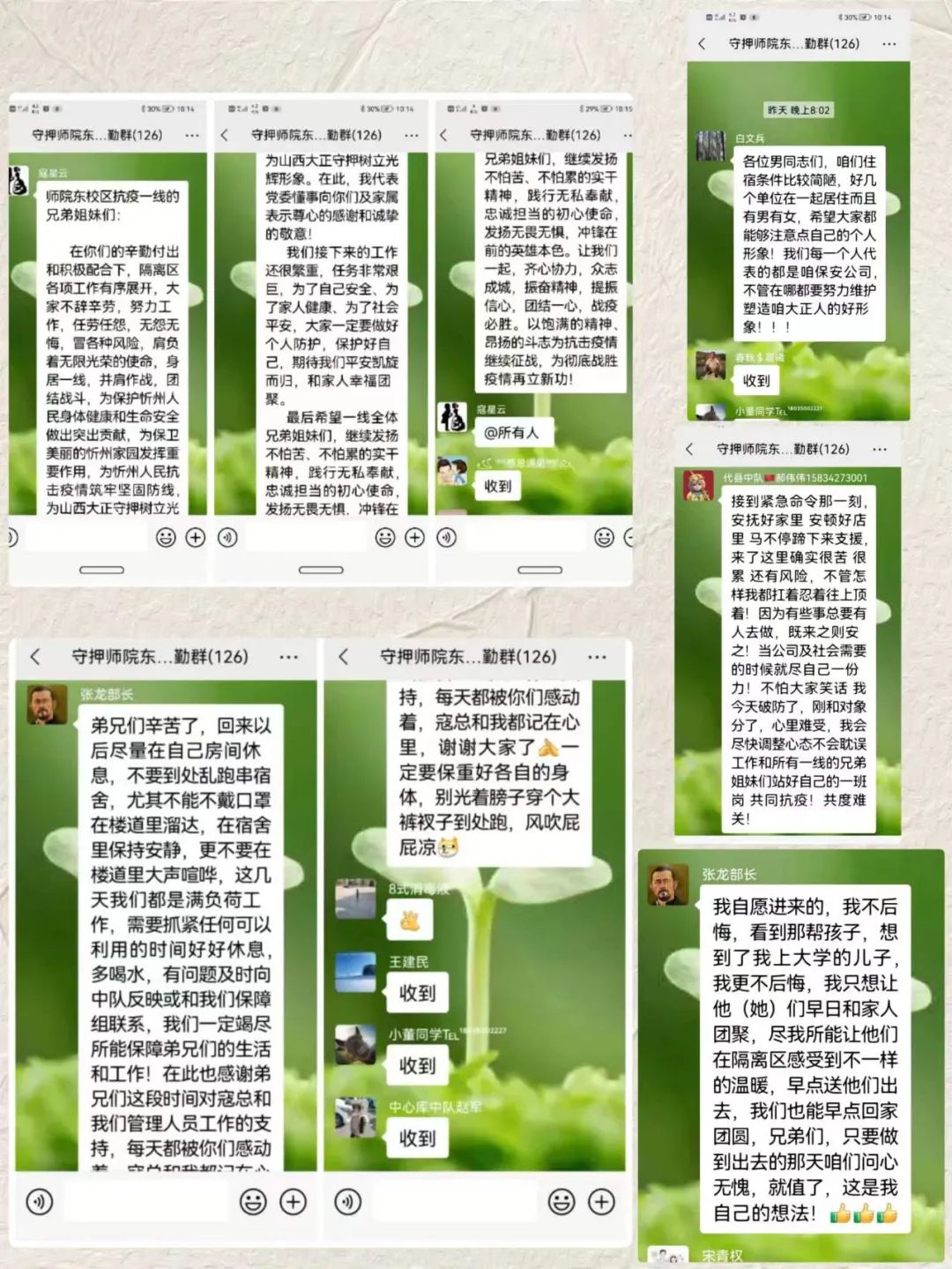 忻州師院東校區(qū)隔離點(diǎn)正式啟用后,寇星云、郭二平分別帶領(lǐng)以守押公司、億通公司人員為主組建的工作區(qū)、隔離區(qū)兩支黨員突擊分隊(duì)進(jìn)駐相應(yīng)區(qū)域,以機(jī)關(guān)和守押監(jiān)控中心、物業(yè)公司、刻章公司、億通公司、文化藝術(shù)公司等單位人員組建的其它三支黨員突擊分隊(duì)在外負(fù)責(zé)保障餐食、物資供應(yīng)。餐食物資保障分隊(duì)隊(duì)員既要克服重重困難采購(gòu)所需食材和生活物資、合理搭配菜譜,又要在保溫、包裝等方面想辦法、下功夫,盡量根據(jù)隔離人員不同口味做到差異化安排搭配,保證葷素搭配、營(yíng)養(yǎng)均衡,盡最大程度滿足隔離人員每日的營(yíng)養(yǎng)需求。預(yù)備應(yīng)急分隊(duì)隊(duì)員往往身兼數(shù)職,哪里需要到哪里,一會(huì)幫忙搬運(yùn)物資,一會(huì)幫忙分裝水果、面包、餅干等輔食,忙的馬不停蹄。餐食物資運(yùn)輸隊(duì)員根據(jù)實(shí)際,科學(xué)合理調(diào)配車輛和路線,保證將餐食、生活物資按時(shí)送達(dá)。在隔離點(diǎn)一線的工作區(qū)、隔離區(qū)隊(duì)員,在做好餐食、物資配送的基礎(chǔ)上,積極協(xié)調(diào)解決隔離人員的合理訴求,讓隔離點(diǎn)如家般溫暖常在,做到了隔離人員、工作人員、隔離點(diǎn)領(lǐng)導(dǎo)組“三滿意”。
