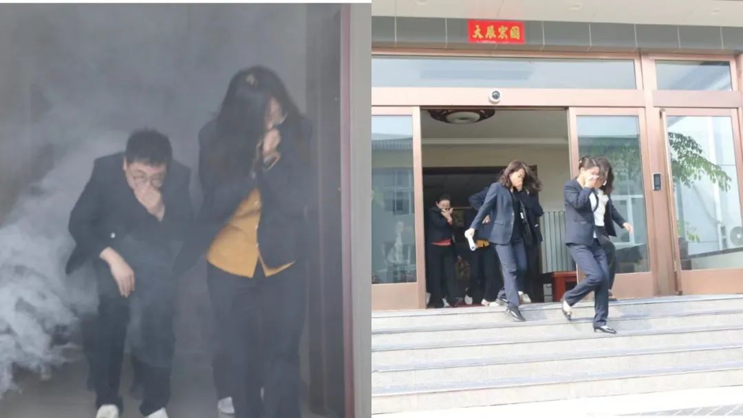 隨著煙霧的升起、消防報警聲的響起,各樓層人員快速、有序地捂住口鼻、彎下身體,快步有序的撤離到辦公樓前安全地帶,隨后,安全保衛(wèi)部清點人數,確保無一人遺漏,整個演練過程緊張有序。演練人員沒有絲毫的慌亂,達到了預期的效果。